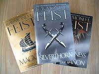 Serien jeg begynte på er skrevet av Raymond E. Feist og heter The Riftwar Saga. Et fortryllende eventyr fylt med magi, action, spenning og intriger. Riktignok leste jeg den første boken på norsk (som er delt opp i to), og da måtte jeg gå over til engelsk da det ikke fantes flere oversettelser til norsk til min store skrekk og gru. Men det gikk faktisk veldig bra. Etter 40- 50 sider begynner teksten å flyte av seg selv.
