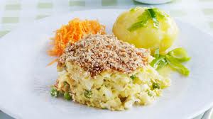 Saus: 4-5 ss smør, 4 dl melk, 4-6 dl fiskekraft, 4 eggeplommer, 3 ss potetmel, 200 g revet Jarlsberg, 1 ts malt muskat, 1 ts salt, litt pepper.