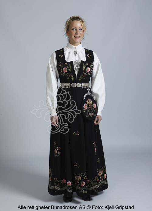 Det er heller ikke alle som kler bunad og det finnes faktisk også ganske mange stygge bunader. Smak og behag. Selv er jeg ikke eier av bunad, men jeg ønsker meg en som jeg kan ha til neste år. Det er faktisk veldig praktisk å ha et sånt plagg hengende i skapet i stedet for å kjøpe nye klær hvert år eller gremmes over ikke å noe å ha på seg. Kvinnfolk klager ofte over at de har stappfulle skap fulle av ingenting. Intet ukjent fenomen der. Men bunad er praktisk av andre årsaker også; nemlig været. De siste årene har været vært temmelig kjølig og guffent og da er bunad kjekt å ha. Som regel er den ganske varm og garantert varmere enn ett av plaggene i det stappfulle skapet fullt av ingenting. Men litt tilbake til dette med om bunad er sexy. Jeg mener fortsatt nei. Det er en folkedrakt som skriver seg mange hundre år tilbake (jeg snakker om ekte bunad med røtter) og jeg forbinder faktisk mange av bunadene med budeier som sitter og melker kyr og geiter. Intet sexy å finne ved det. På bildet under ser du festbunad fra Nes. For meg så ser det ut som en fotsid kjole med et forferdelig blomstermotiv for å eventuelt skjule at man er altfor stor. Ser ut som en sekk med mønster på. Fortsatt ikke sexy og man kan fint melke kuer i et slikt plagg og det er nesten så jeg hører noen roper på Dagros i bakgrunnen når jeg ser på bildet….
