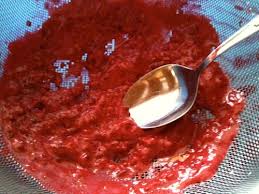 Tin de forsne bringebærene i en bolle og tilsett sukker. Det er viktig å la de tine helt så du får ut all saften og ikke bare litt. Dette avhenger nemlig av hvor frisk smaken blir. Kjør så bringebær og sukker hurtig med en håndmixer så du får «løsnet» mesteparten av bringebærene fra steinene. Ta så en sil og ha en dyp skål/ bolle under så saften av bringebærene kan renne ut. Bruk en spiseskje og «spa» massen frem og tilbake til du til slutt bare har steiner og bringebærkjøtt igjen.