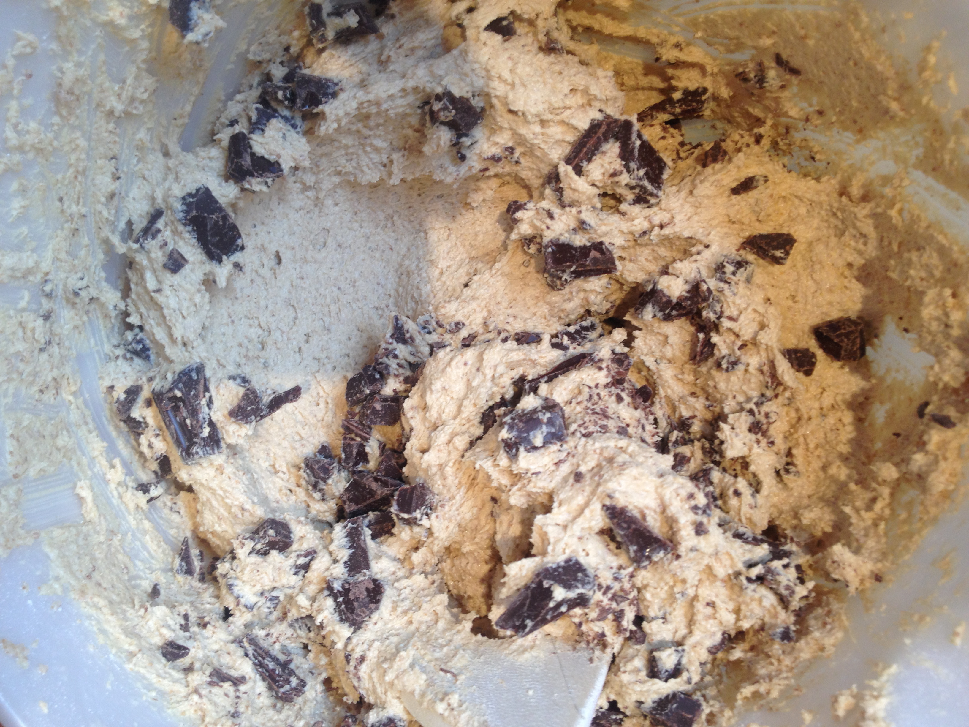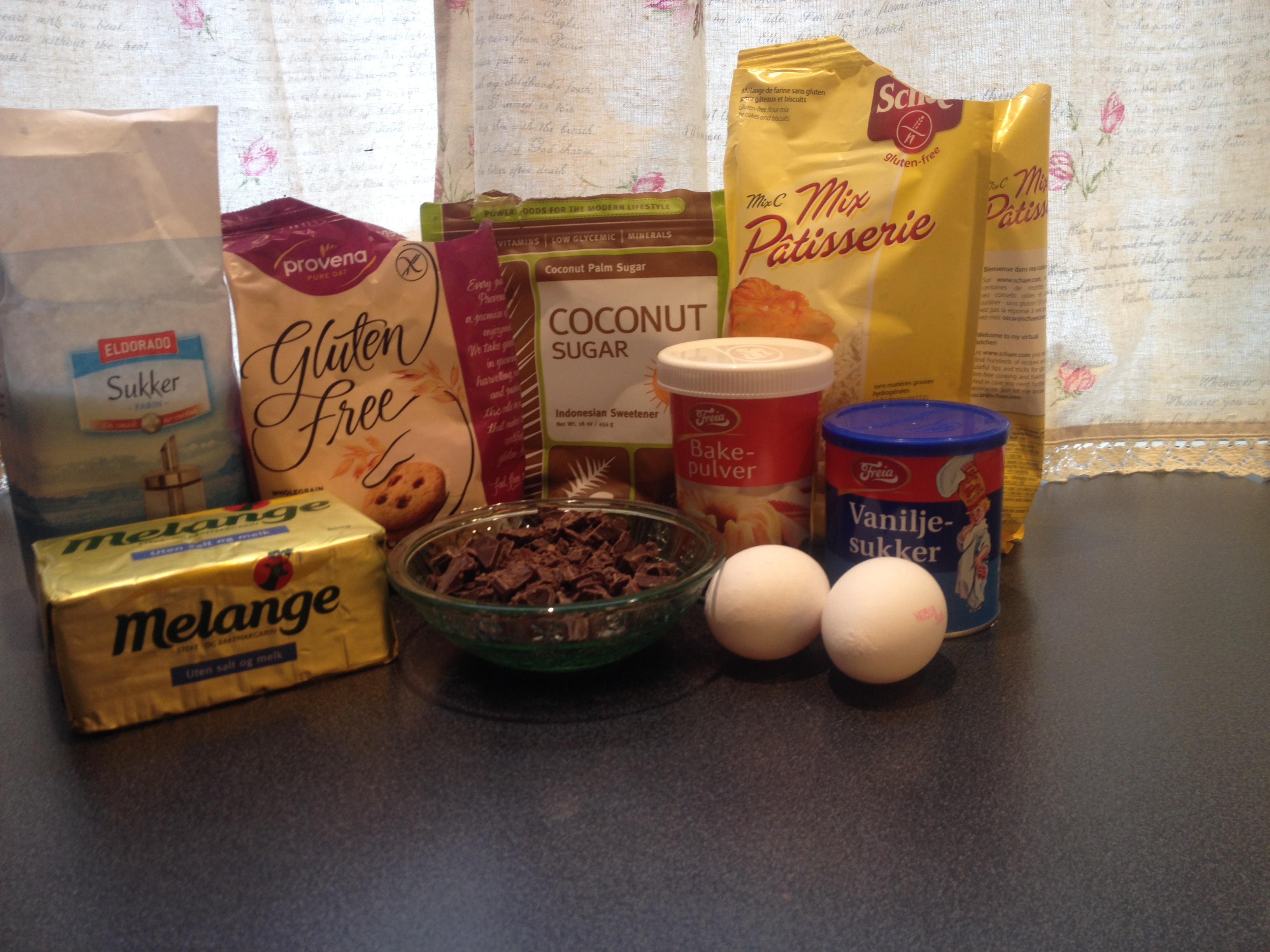 Dette trenger du: 240 g mykt smør (margarin), 180 g brunt sukker (jeg brukte palmesukker fra iHerb), 180 g hvitt sukker, 200 g Schâer patisserie micx c, 180 g Provena havremel (kjøpt i Sverige), 1 1/2 plate kokesjokolade, 2 egg, 2 ts bakepulver og 2 ts vaniljesukker.